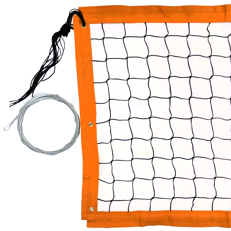 Верхняя и нижняя ограничительные, а также боковые ленты имеют ширину 7,5 см и выполнены из полиэстера оранжевого цвета. Полотно сетки из специального светостабилизированного, водоотталкивающего пропилена черного цвета (толщина нити 3,5 мм, ячейка 10см*10см). Применение данных материалов позволяет использовать сетку на открытых площадках при игре в агрессивных погодных условиях (яркий свет, дождь, высокая влажность, низкая температура воздуха) без угрозы растяжения и провисания полотна сетки, и разрушения структуры материала. Для равномерного натяжения сетки в боковых лентах предусмотрены по 3 полипропиленовых шнура с каждой стороны.