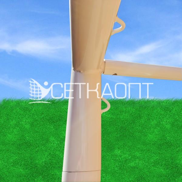 Круглый алюминиевый профиль Ø 75мм с безопасными петлями для крепления сетки. Ворота представляют собой сборную конструкцию, состоящую из боковин, которые крепятся между собой перекладинами, с помощью болтовых соединений. Задняя рама ворот изготавливается из круглого профиля Ø  40 мм.