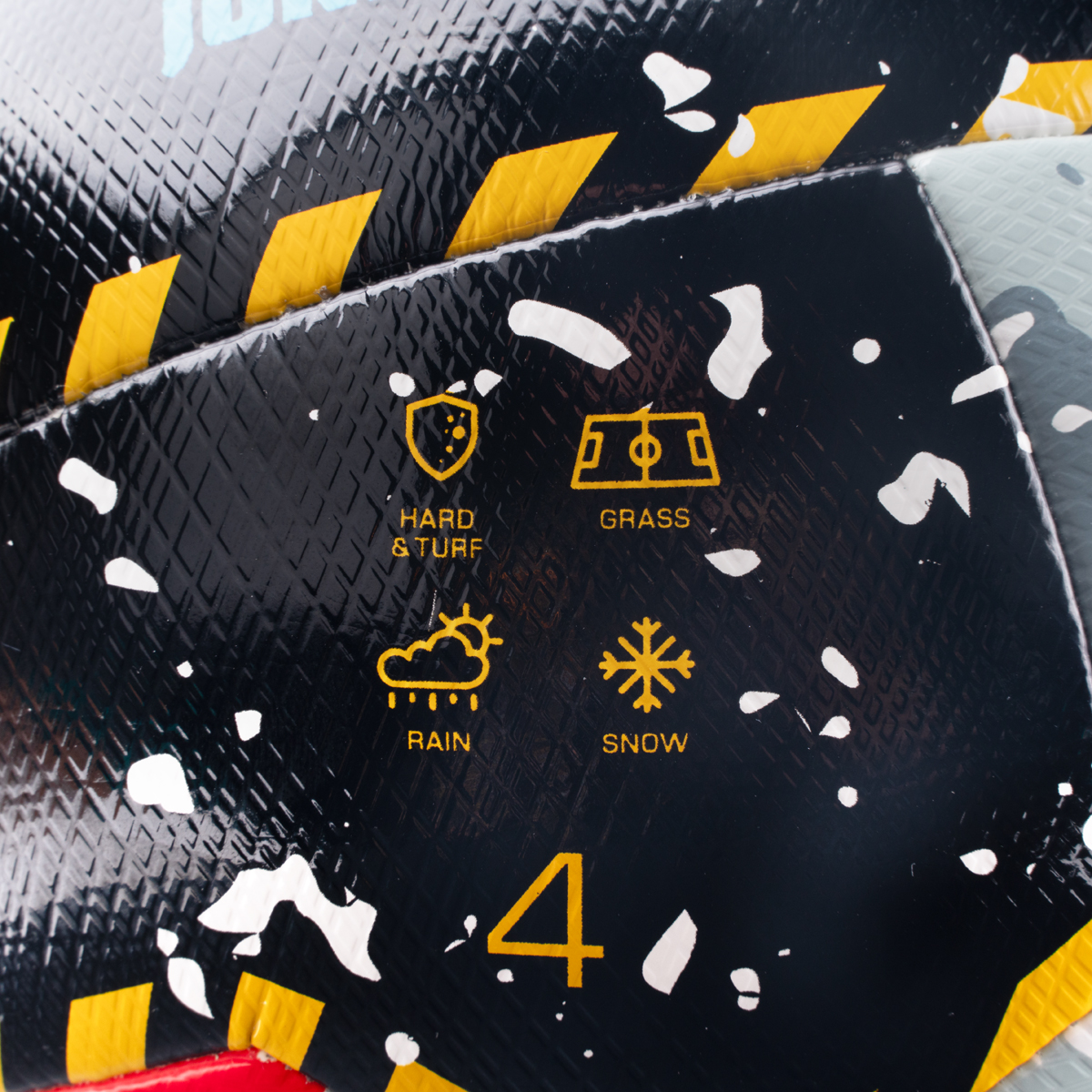 Мягкий полиуретан толщиной 0.7 мм на тканой основе со структурированной поверхностью,значительно улучшает сцепление между мячом, бутсами и перчатками, способствует лучшей передаче силы удара. Слой высокотехнологичной 2-мм сверхмягкой пены, ламинированный 4мя слоями прочной ткани с использованием латексного клея, делает мяч мягким и износостойким. Резиновая камера с бутиловым ниппелем.